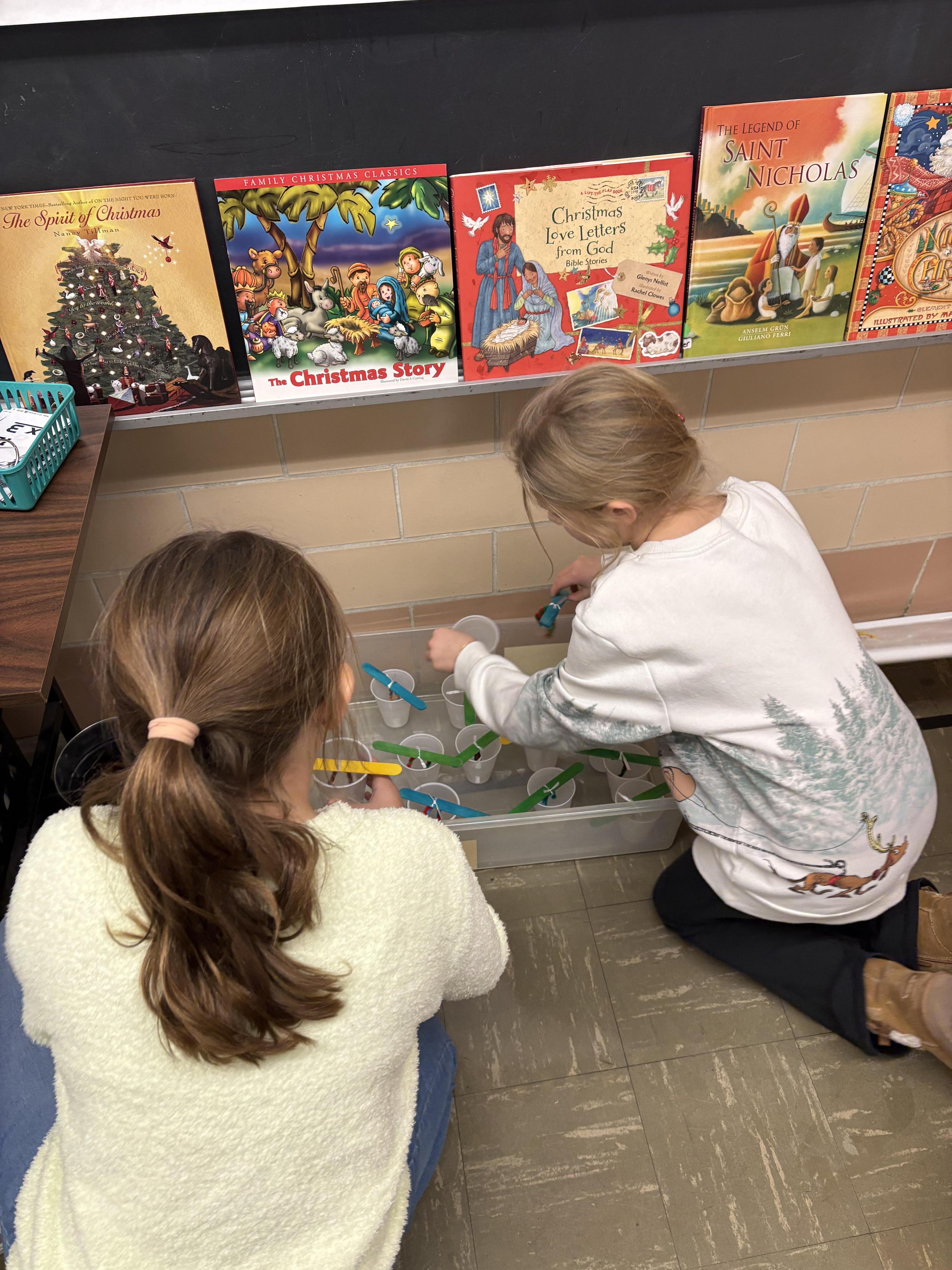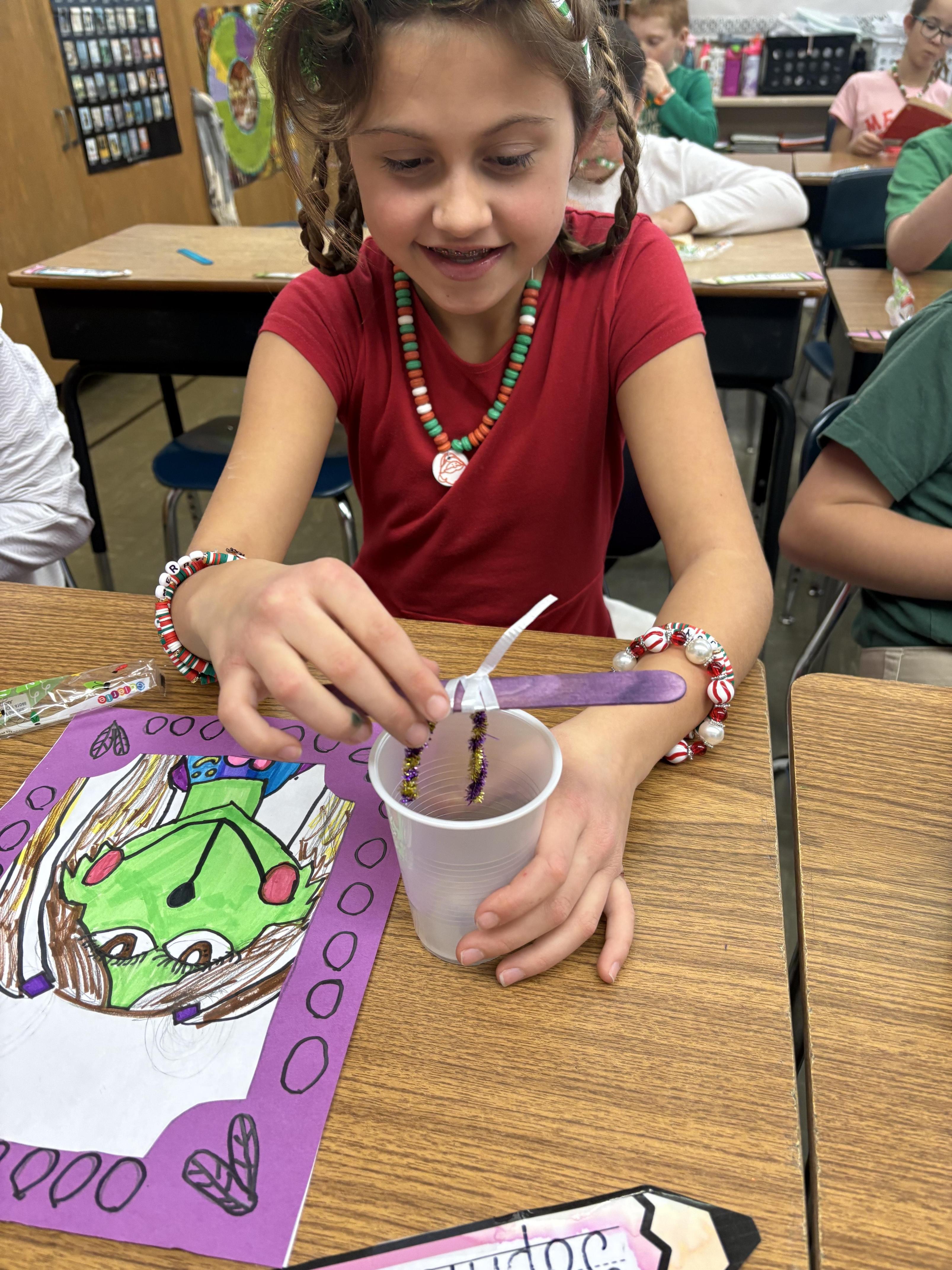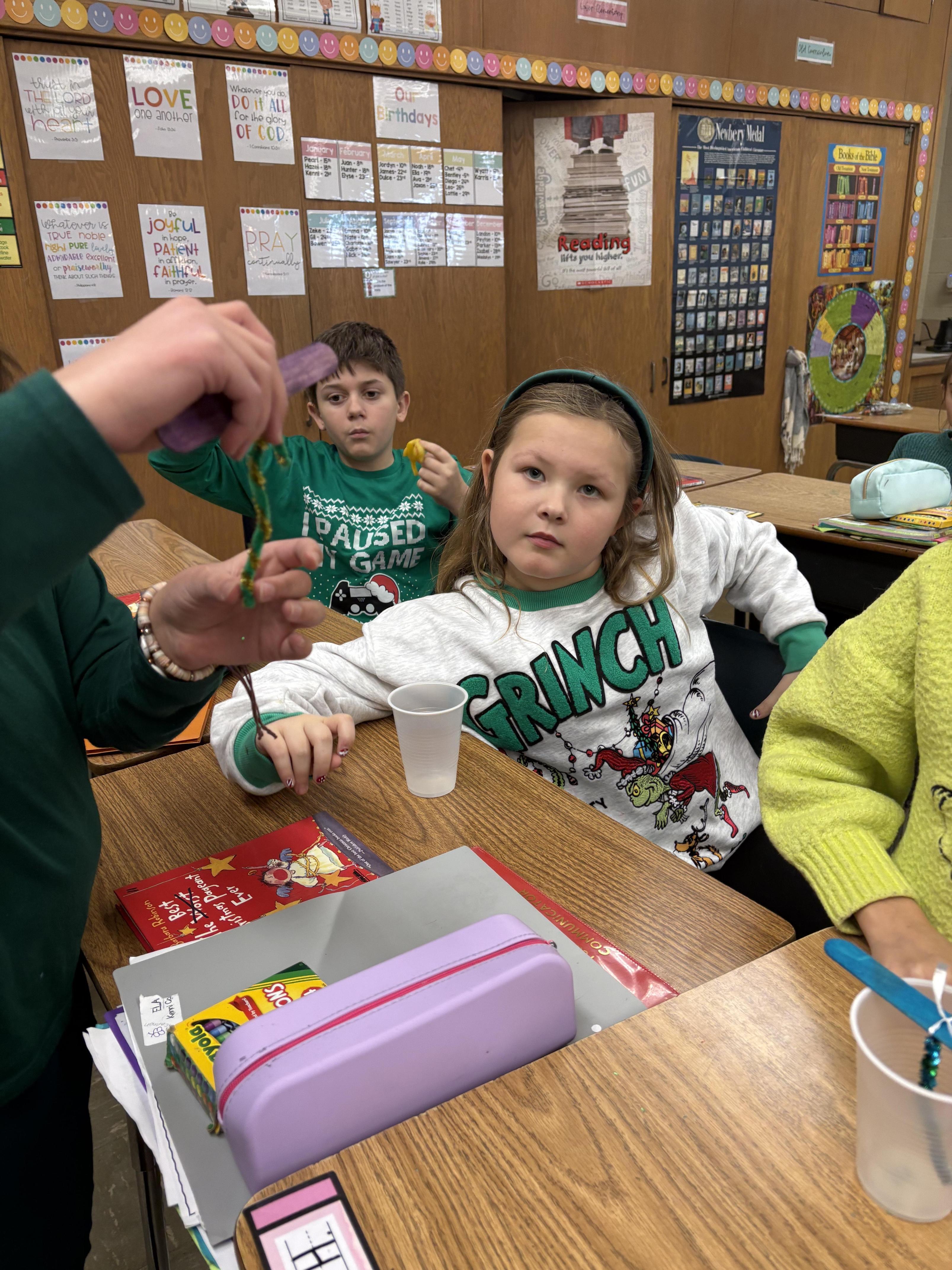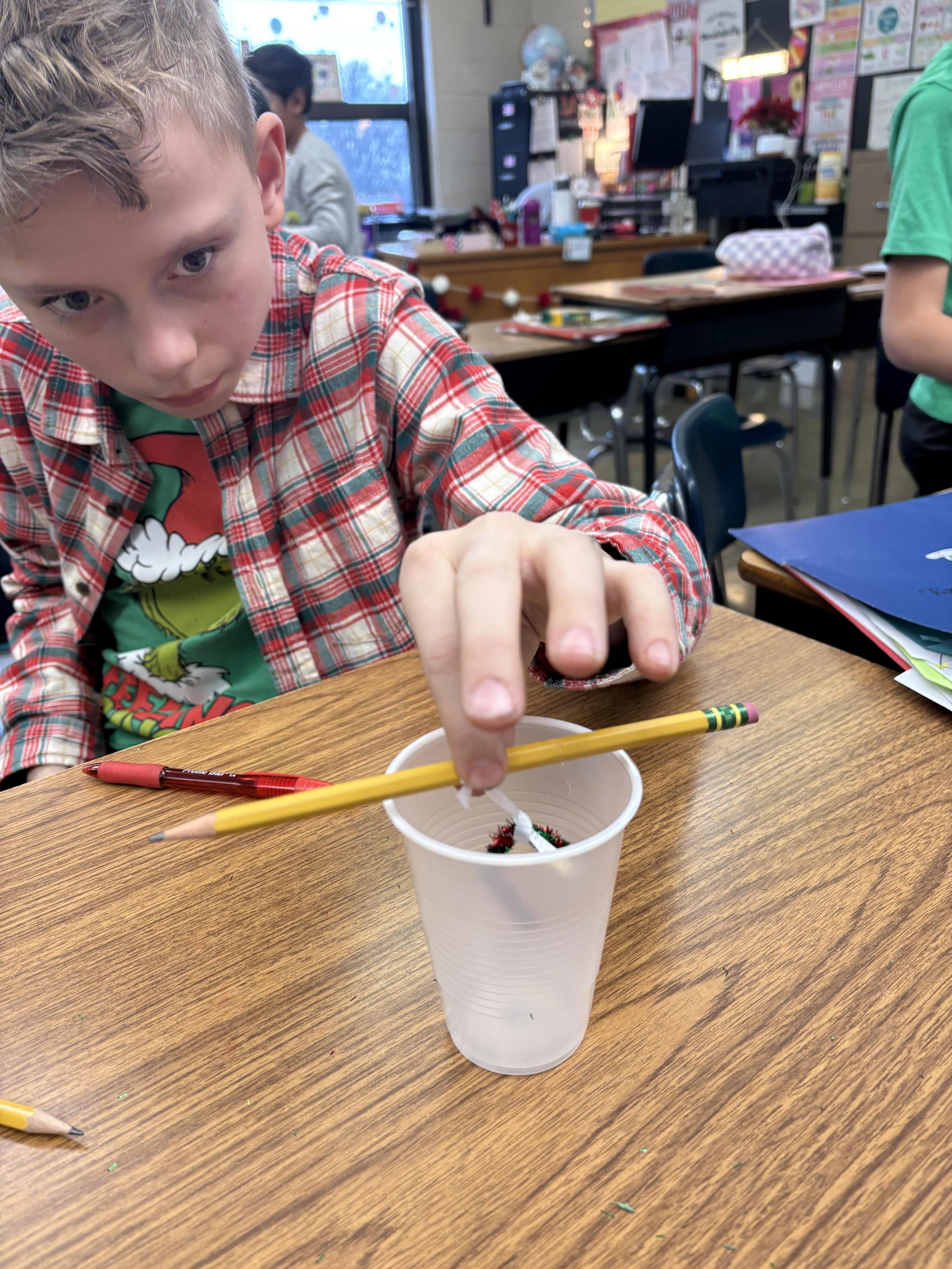 4th grade students conducted a science experiment to see if a chemical reaction would occur between borax and boiling water. They created candy cane shapes using two pipe cleaners while Miss Nixon carefully poured the borax and boiling water into the cups.