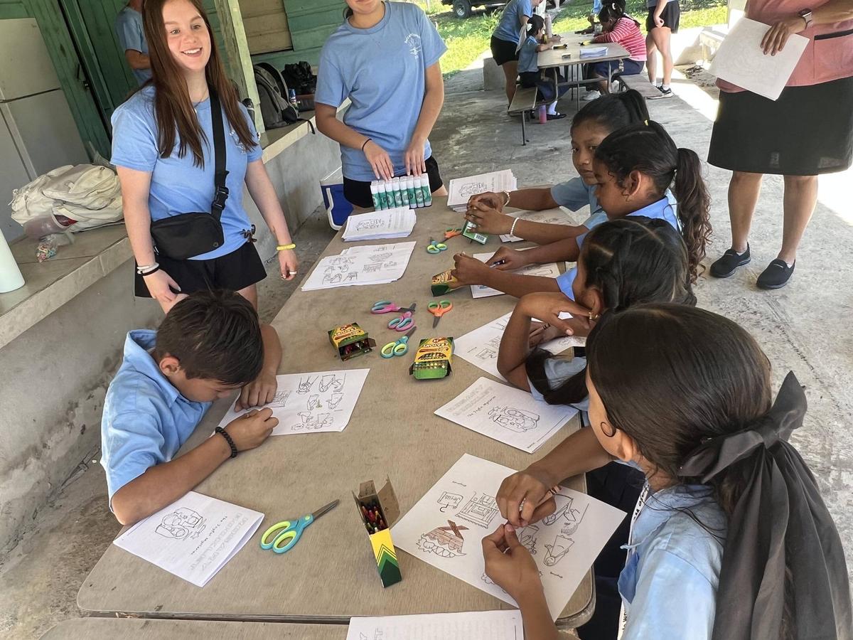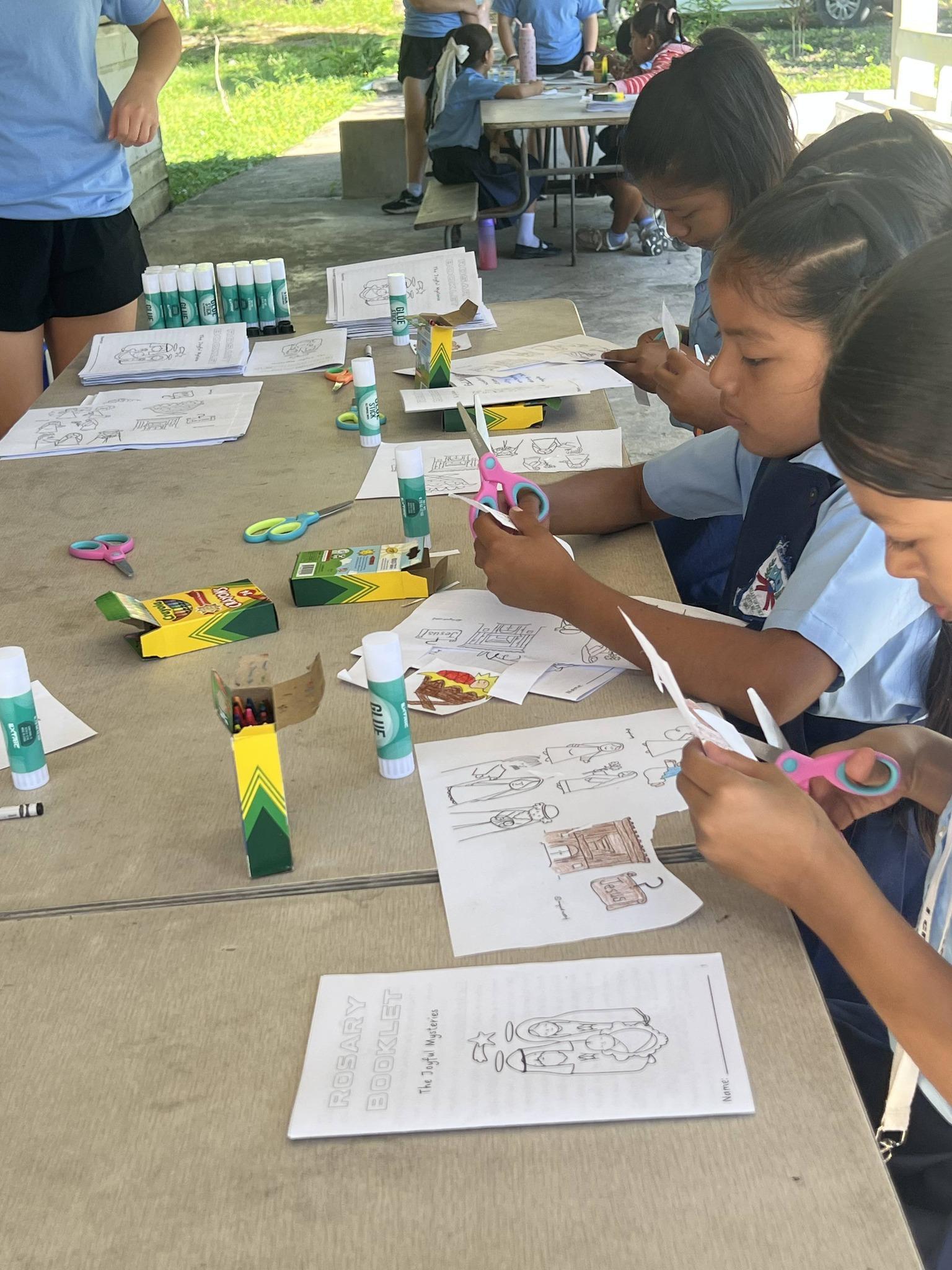 On day 2 of our mission trip the team led a First Communion retreat for students from St. Oscar Romero Roman Catholic School. We were blessed to host the retreat at the local, Our Lady of Guadalupe Catholic Church Retreat Center. The team led the students through 5 different stations. They practiced receiving the Eucharist, made a decade rosary keychain, learned about the joyful mysteries of the rosary, created a class monstrance out of their handprints, and completed a First Communion activity booklet. Both the team and the SORRC students enjoyed playing games, learning, and praying together. Our team was able to connect with a few Flyers back home during the retreat to further strengthen the connection between our communities. The retreat concluded with one of the students leading the group in praying the Our Father in Spanish. Our team was energized by the experience and we are looking forward to leading a Confirmation retreat later this week.