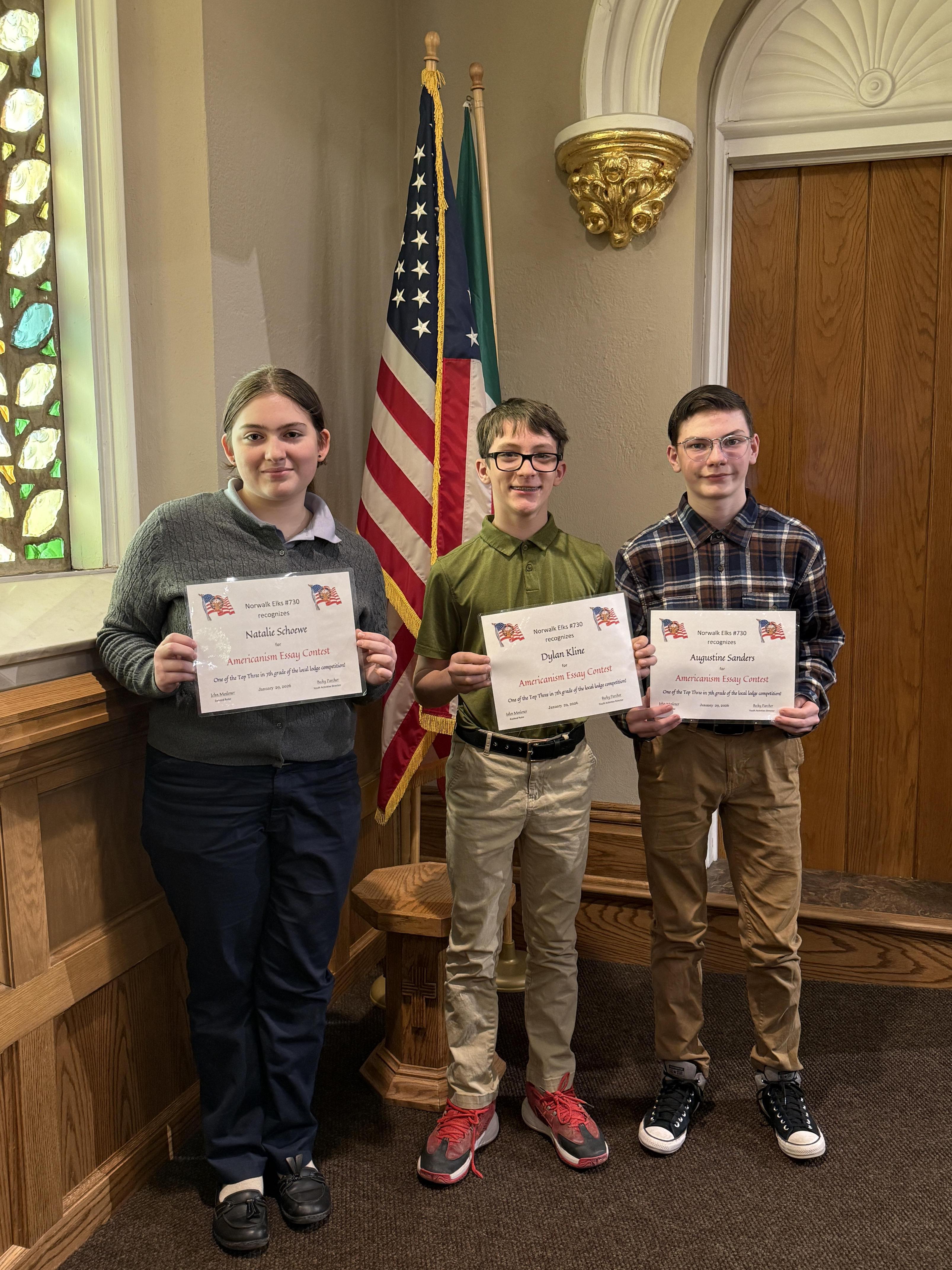 Their thoughtful and inspiring essays will now advance to the District competition, where they will compete against entries from 12 other Elks lodges.