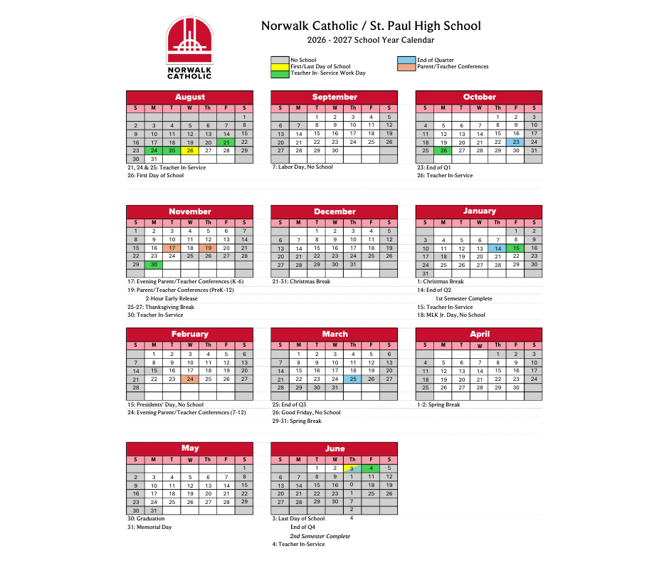 At the heart of a Catholic education is a belief that has guided our school since its founding; that the formation of a child is sacred work, and that faith, learning, and community are at our core. Norwalk Catholic/St. Paul High School is honored to walk that journey alongside your family.