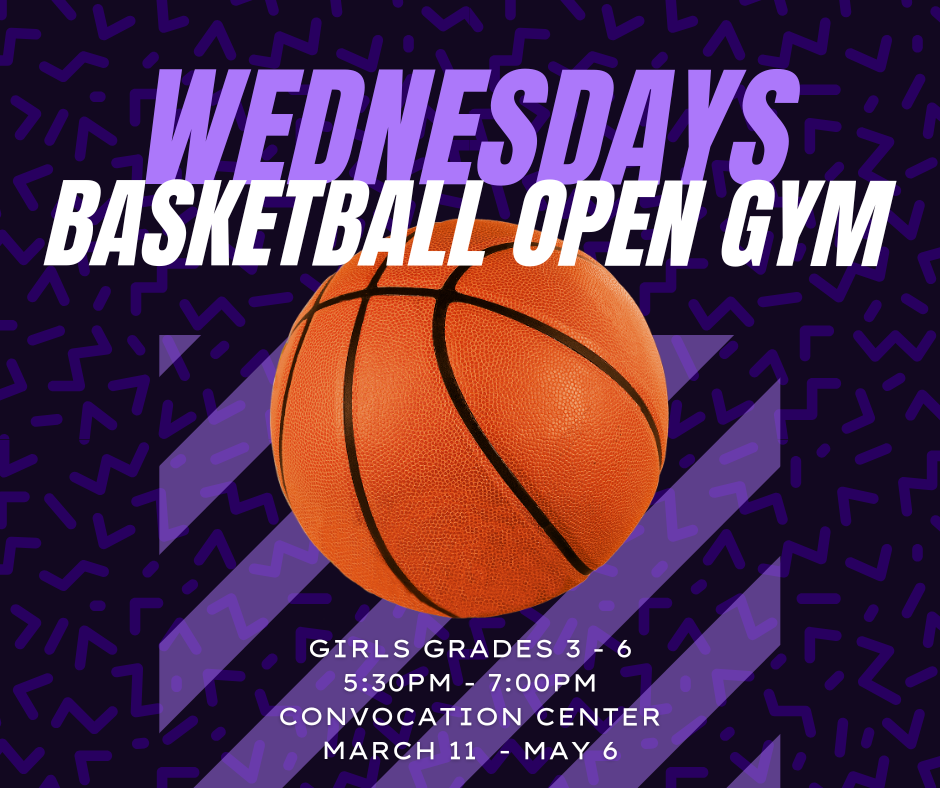 Girls Basketball Open Gyms for current 3rd-6th graders will begin Wednesday 3/11/26, occurring each Wednesday from 5:30-7:00pm in the Convocation Center through May 6th. Open Gyms are geared to allow athletes time to put individual focus on their game, with assistance and guidance from the coaching staff as needed. No experience is necessary to attend Open Gyms...just come out and get your hands on a ball and have some fun with us! This is a non-mandatory, free program.