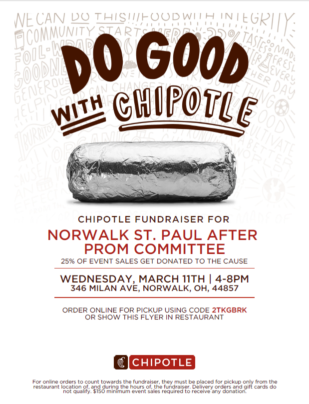 Today is the day. Eat at Chipotle today (Wednesday) between 4-8pm and support St. Paul HS After Prom. Use this Code 2TKGBRK when ordering online or show the flyer when going in the Norwalk Chipotle.