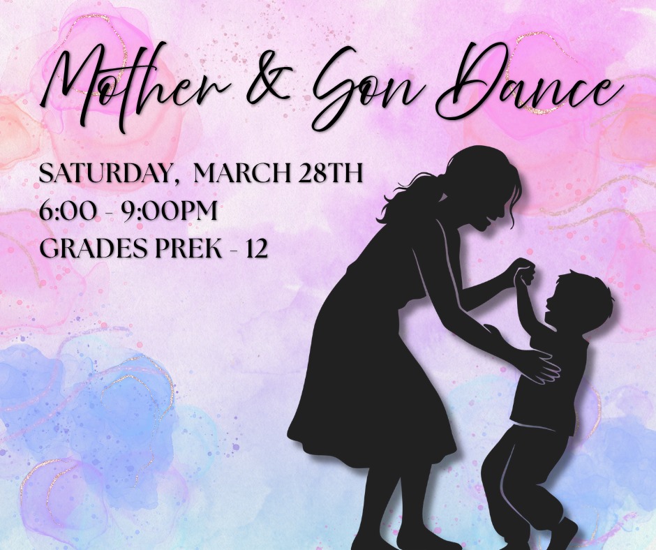 Come for a fun night at the Mother and Son Dance Saturday, March 28, 6:00 to 9:00pm. The dance is open for grades PK through 12. If you can't bring your mom, you are able to bring your grandmother or Aunt. There will be dancing, desserts, flowers, photo booth, and quality time with each other. There is no cost to attend. To RSVP, email [email protected].