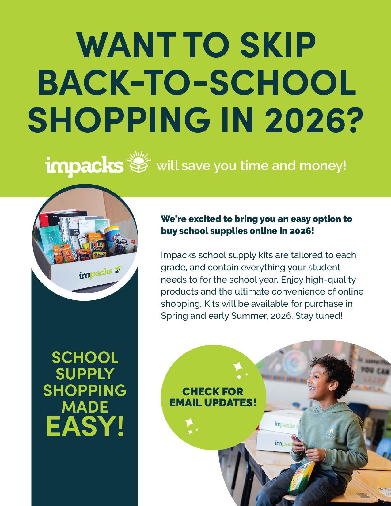 PTO is excited to introduce Impacks School Supply Kits for back-to-school shopping for the 2026–27 school year. We’re looking forward to partnering with this new company because of its easy-to-use digital storefront, strong organization, and the flexibility it offers families. Parents will have the option to choose specific school supply items instead of purchasing a full kit, making it more convenient and cost-effective. More details will be shared soon!